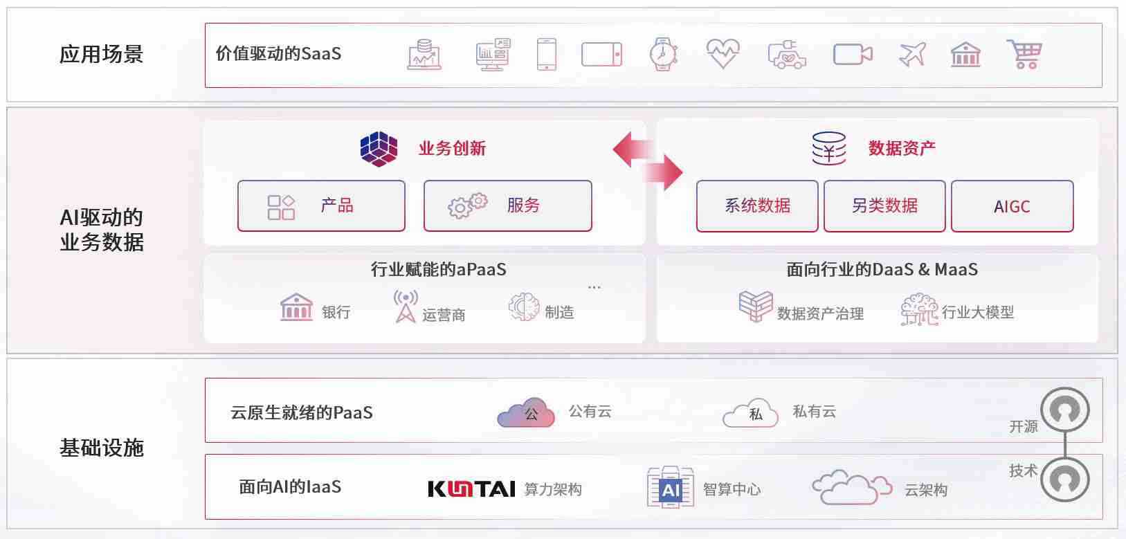 数字时代,,围绕企业数字化转型的关键要素,,,z6com尊龙凯时数码开创性的提出数云融合战略和技术体系框架,,,,着力在云原生、、、、数字原生、、、、AI原生和信创产业上架构产品和服务能力,,,,为处在不同数字化转型阶段的快消零售、、、汽车、、、金融、、医疗、、、、政企、、教育、、、运营商等行业客户提供泛在的敏捷IT能力和融合的数据驱动能力,,构建跨界融合创新的数字业务场景和新业务模式,,,,助力企业级客户建立面向未来的核心能力和竞争优势,,,,全面推动社会的数字化、、、、智能化转型升级。。