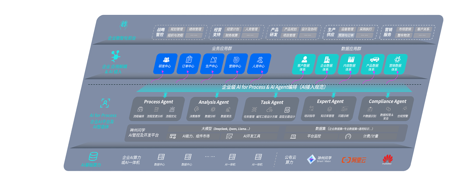 端到端的一站式AI工作空间深度融合了从企业战略规划到日常经营的全流程业务板块,,,定向解决车企内部领域多、、部门多、、、链条长、、、、场景碎片化等难题,,,,支持车企快速构建以AI为核心的生产力写作体系,,,,实现任务执行与AI能力的无缝集成与交互